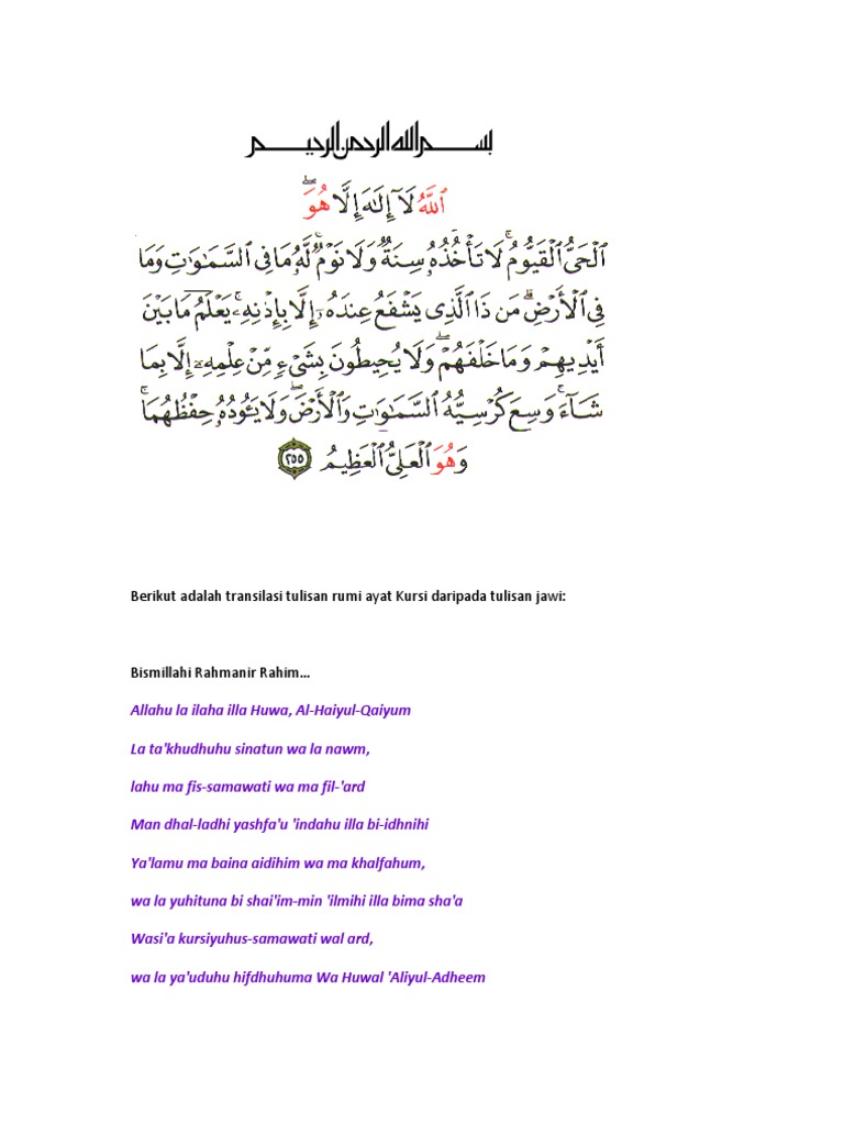 Baca ayat kursi arab dan ayatul kursi bahasa indonesia lengkap dengan latin. Ayat kursi rumi jawi dan terjemahan alhamdulillah kami panjatkan kehadirat alloh swt yang memberi nikmah hingga kita dapat bersua di blog wirid dan doa nih. Ayat kursi (jawi & rumi) these pictures of this page are about:surah kursi rumi. Ketika ayat kursi mau diturunkan oleh allah ke bumi kepada nabi muhammad dengan perantara malaikat jibril yang disertai oleh 70 ribu malaikat. Dalam sebuah hadits riwayat muslim disebutkan bahwa ayat ini adalah yang paling agung didalam al quran.